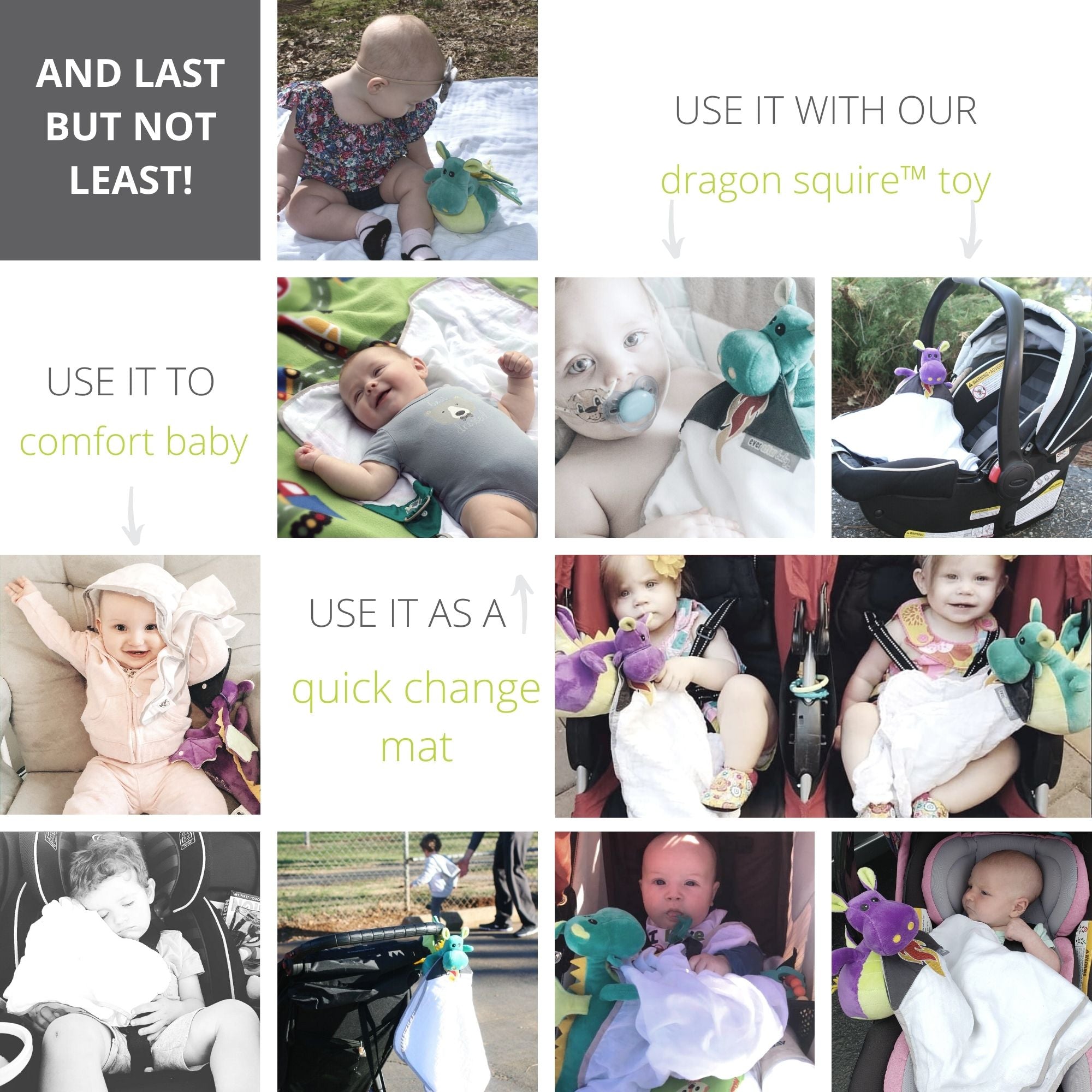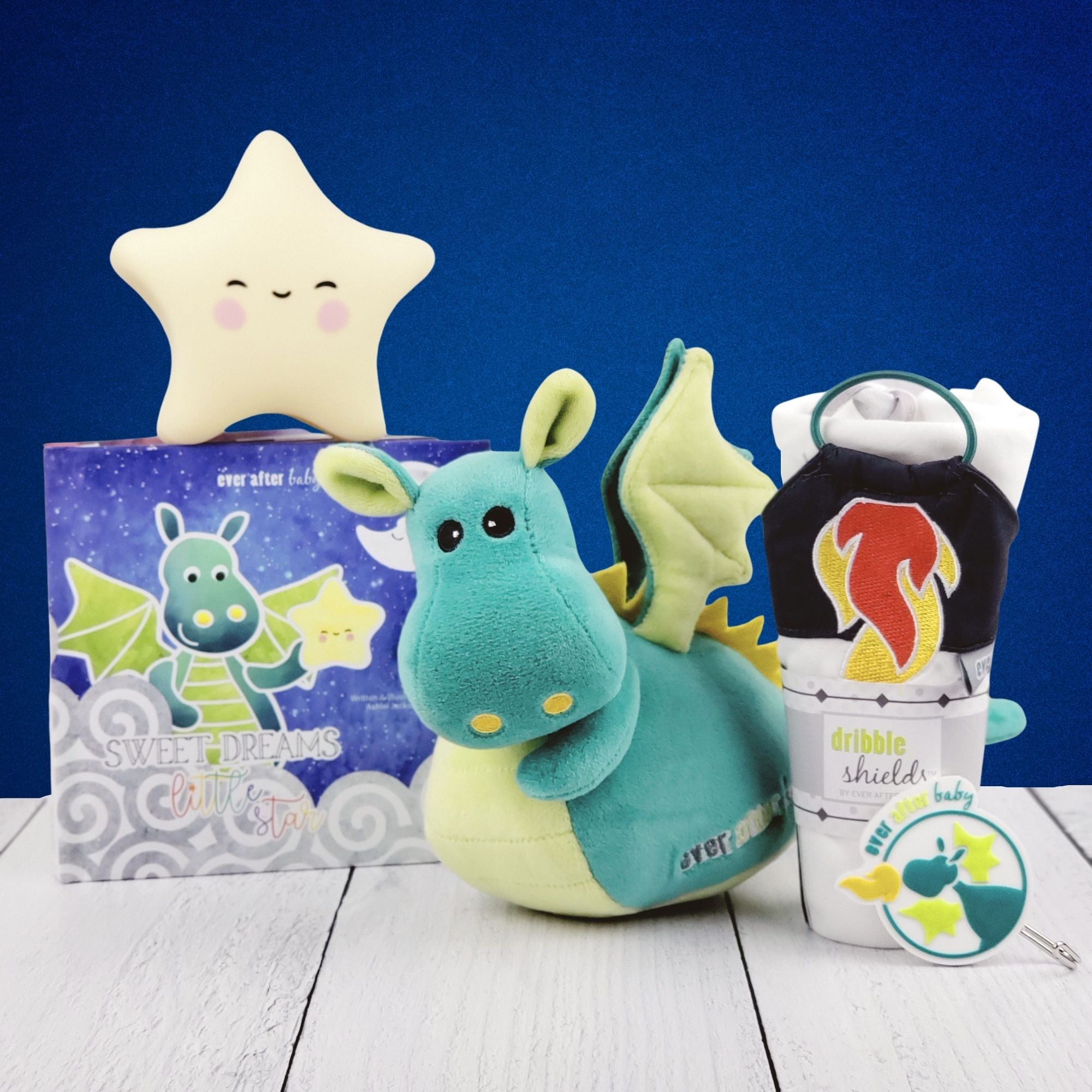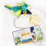 Studies have shown that kids who spend time holding a stuffed toy tend to feel calmer and more secure than those who don't. Even though the toy is an inanimate object, a bond is formed. Our Dragon Squire plush toy matches the character in the book and is perfect for snuggle bonding! Plus it works with the included Dribble Shield⢠multipurpose cloth - which can comfort as a lovey blanket, wipe away tears and handle messes too.